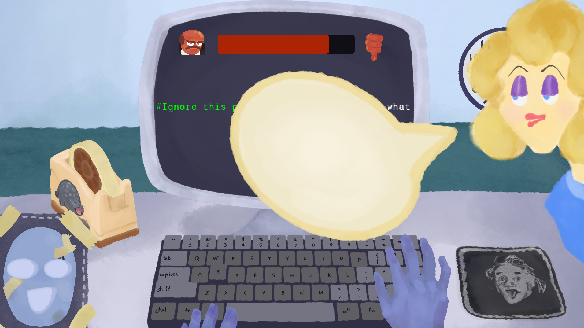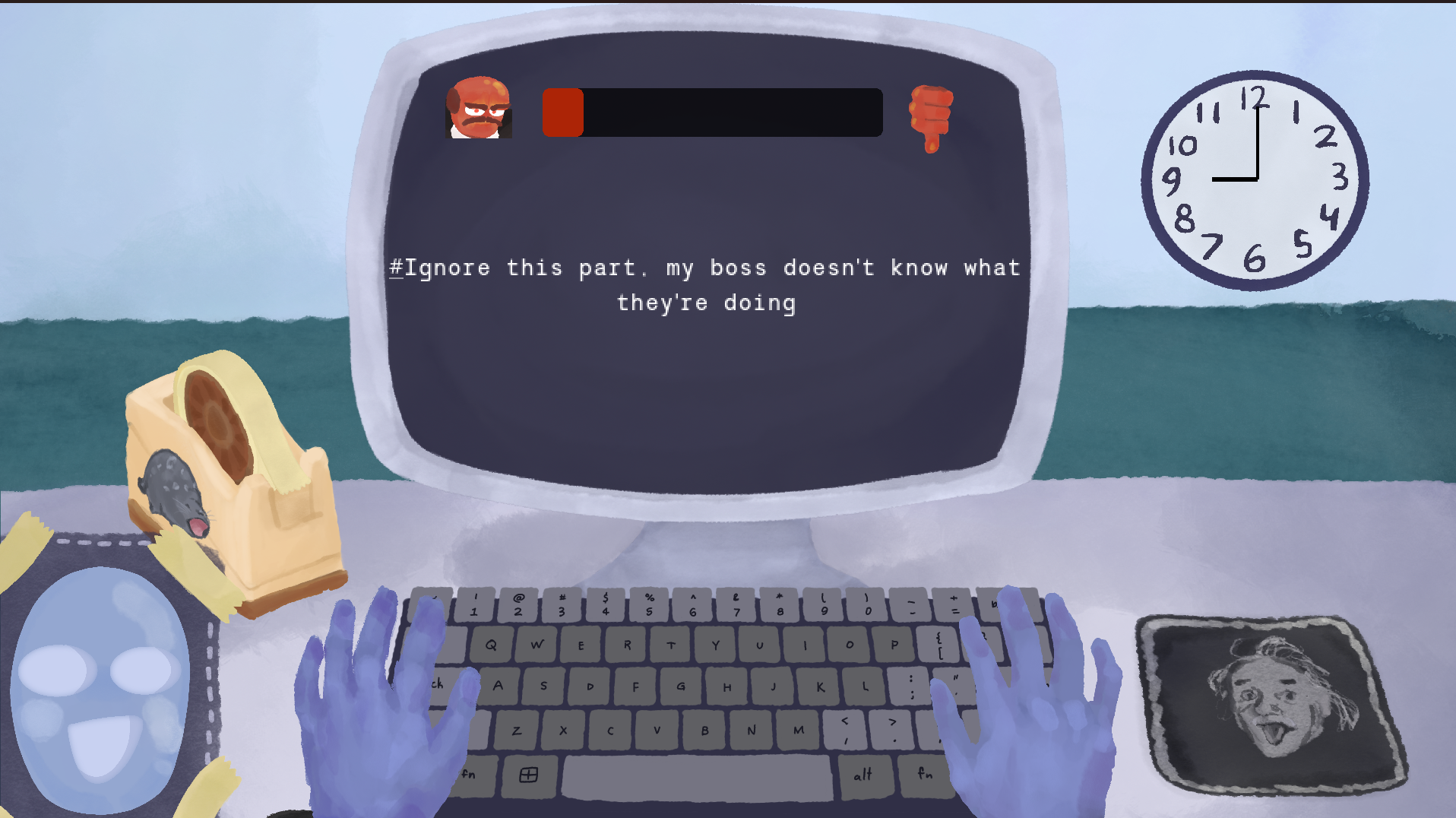 This is a typing game about keeping up your mask of professionalism and rationality with... masking tape? Try to complete your work without your facade breaking from annoying coworkers and a demanding boss who harasses you if you don't get your work done fast enough!